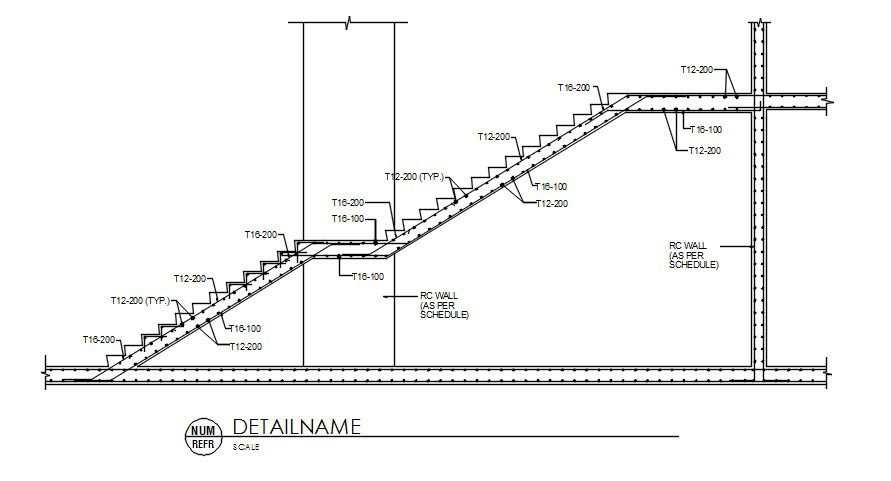 Staircase Reinforcement and the side section details are given in this AutoCAD Drawing File. In this file, Thread and riser, precast mid landing design detail, duct, RC wall, the Staircase detailed sectional details were clearly given. The side elevation of the staircase is given in detail. The section detail and the dimension were also are given clearly in this drawing. Download the free AutoCAD file now. Thanks for downloading the file and another CAD program from the cadbull.com website.
