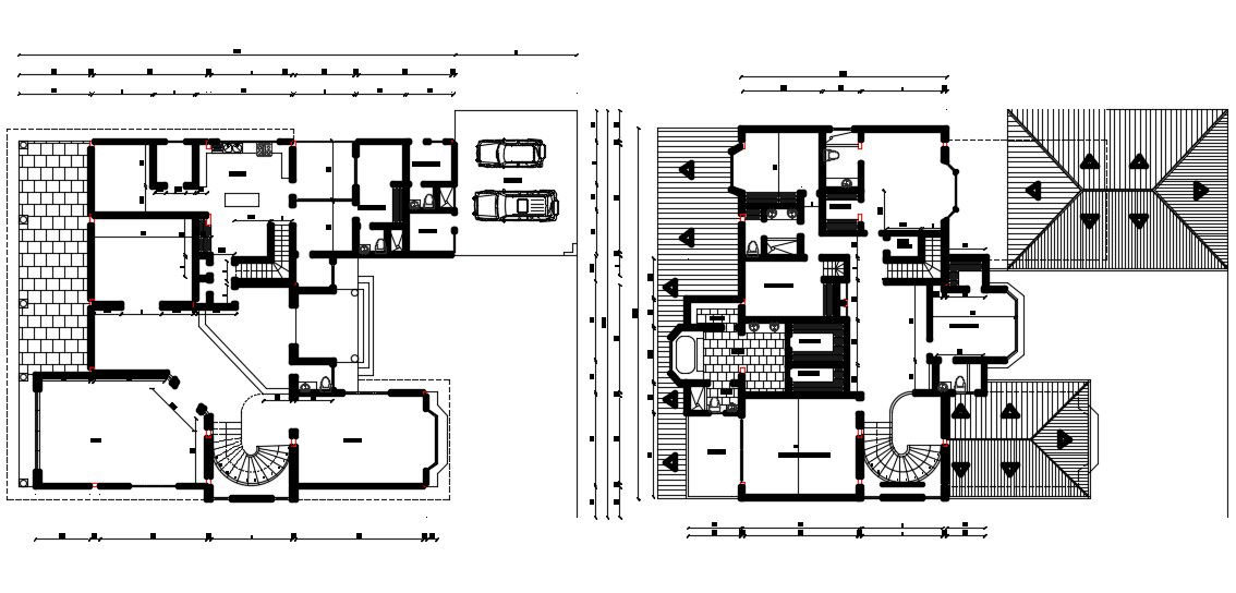 The Architecture space planning for residence house ground floor and first floor layout plan which consist 5 bedroom with master bathroom, back yard, modular kitchen, drawing room, living lounge, store room, servant room, pray room and 2 big car parking garage with all dimension detail. download 500 square meter house plan drawing DWG file.