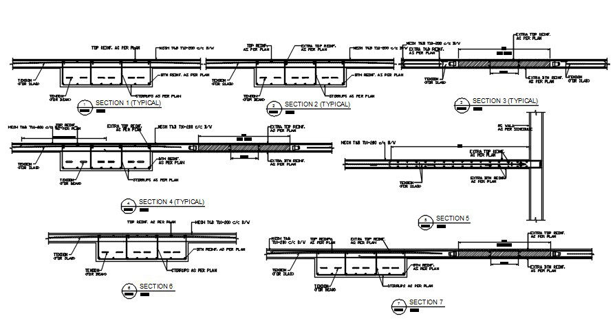 Typical Reinforcement section details of the slab are given in this AutoCAD Drawing File. Download the AutoCAD file now.