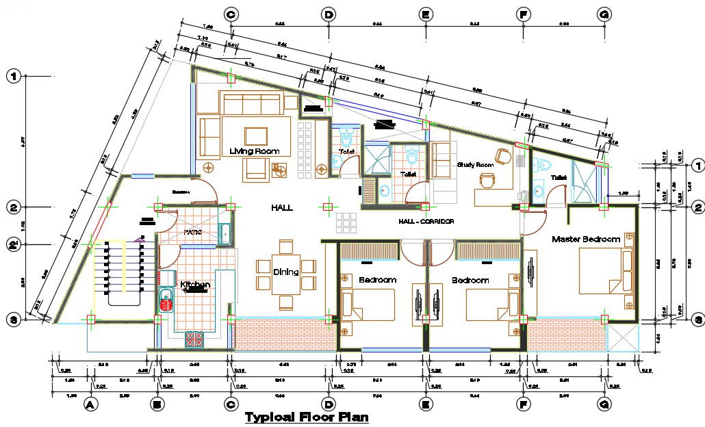 The typical apartment floor plan has been drawing in AutoCAD format, the architecture apartment plan with furniture layout CAD drawing which consist 3 bedrooms, study room, hall, living room, dining area, and kitchen. also has center line plan with all dimension detail. download 3 BHK residence house floor plan design DWG file and apply in your new project.