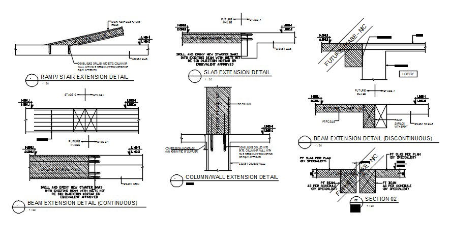 Ramp or stair Extension detail are provided in this AutoCAD DWG Drawing File. In this file, Ramp or stair extension detail, slab extension detail, beam extension detail, column or wall extension detail, and sectional details were clearly given. The section detail and the dimension were also are given clearly in this drawing. Download the AutoCAD file now. Thanks for downloading the file and another CAD program from the cadbull.com website.