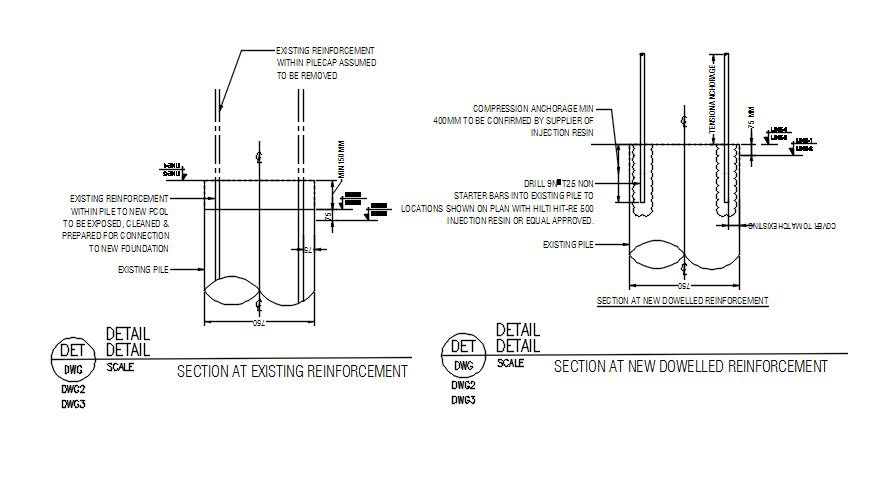 The section at new dowelled reinforcement and existing reinforcement are given in this AutoCAD Drawing File. In this file, Existing reinforcement details, columns, starter bars, existing pile, new dowelled reinforcement, and the sectional details were clearly given. The section detail and the dimension were also are given clearly in this drawing. Download the AutoCAD file now. Thanks for downloading the 2d AutoCAD file and another CAD program from the cadbull.com website.