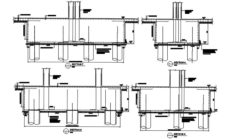 Four separate section details of the pile foundation are given in this AutoCAD Drawing File. Download the free AutoCAD file now.