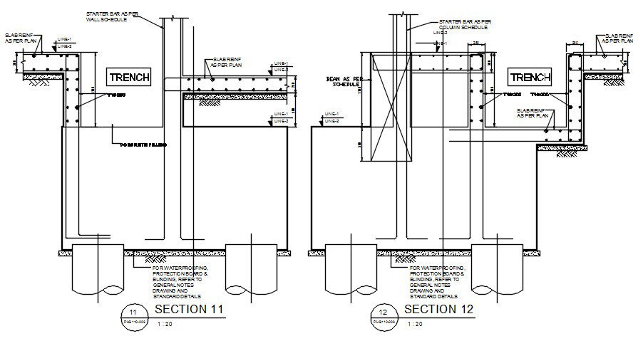Trench pile cap typical reinforcement of slab and wall schedule section details are provided in this 2d AutoCAD Drawing File,Download the AutoCAD file now.