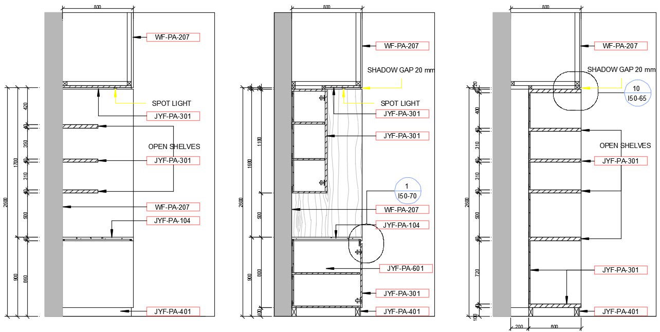 Section detail of the wardrobe presented in this AutoCAD drawing file. in this file, three different side section detail with niece detail and storage detail is .also given joinery detail given with full dimensions and lights detail. Download this 2d AutoCAD drawing file.