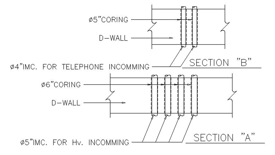 Telephone Incoming and HV incoming layout section plan are provided in this 2D CAD DWG drawing. Typical Sectional details are clearly given in this drawing file. Telephone Incoming, coring, D wall, HV incoming layout plan drawing, dimensions, connection details, and section details are given in this DWG file. This 2d drawing is useful for civil engineers and architects. Download the AutoCAD 2D DWG file. Thank you so much for downloading DWG file from our website