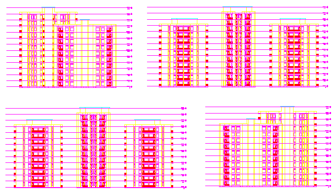 This is a Elevation design drawing of multi story building with east side, west side,North side and south side elevation in this auto cad file drawing.