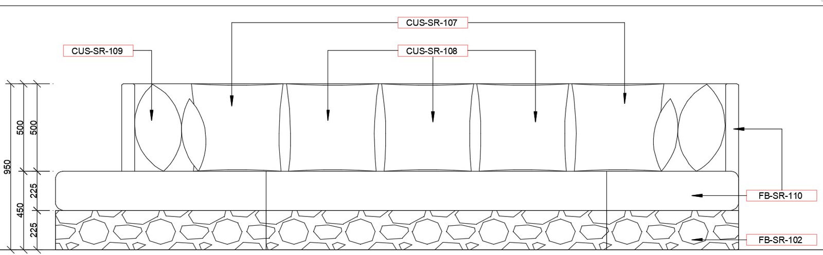 Front elevation of the sofa provided in this AutoCAD drawing file. in this drawing for a sofa, high-density cushion foam velcroed used in it. all cushions have different material codes given. this can be used by architects and interior designers. Download this 2d AutoCAD drawing file.