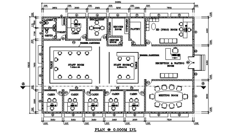 Hotel floor plan detail drawing provided in this AutoCAD drawing file. staff room, reception and waiting room, meeting room, cabin room given with dimensions, and naming detail are also given in this cad drawing file. this can be used by architects and engineers. Download this 2d Autocad drawing file.