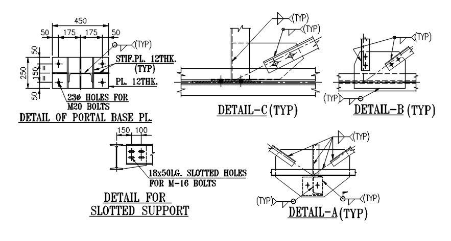 Detail for slotted support presented in this AutoCAD drawing file. also the detail of portal base pl. three-section detail also is given in it with dimensions and name details. this can be used by architects and engineers. Download this 2d AutoCAD drawing file.