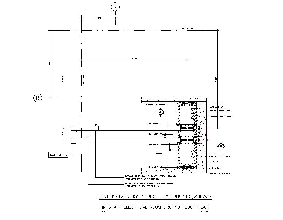 Enlarged detail installation support for bus duct wirewayin shaft electrical room drawing stated in this AutoCAD file. Download this 2d Auto-CAD drawing file.