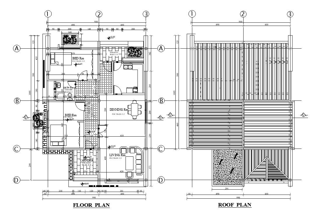 Floor plan detail provided of residence in this AutoCAD drawing file. this drawing consists of a roof plan and living room, dining area, two bedroom detail with dimensions, and naming detail is given in this Autocad drawing file. this can be used by architects and engineers. Download this 2d AutoCAD drawing file.