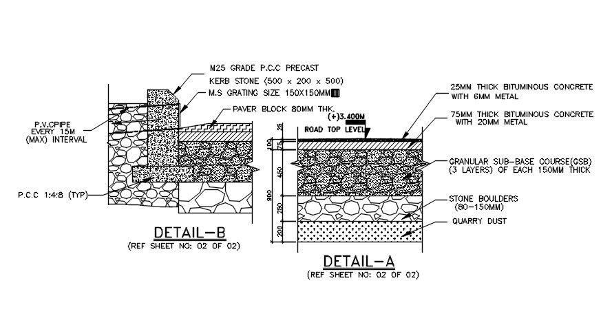 Road section detail specified in this AutoCAD drawing file. this drawing consists of quarry dust, stone boulders, sub-base course, and PCC pre cast detail given with dimensions and naming detail in this AutoCAD drawing file. this can be used by architects and civil engineers. Download this 2d AutoCAD drawing file.
