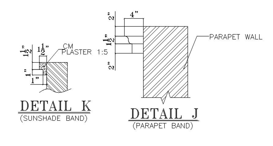 AutoCAD section plan sunshade band and parapet band of a multi purpose office with store building is described. Material specifications of the parapet wall and the dimensions are detailed. Download the AutoCAD2D file form our website.