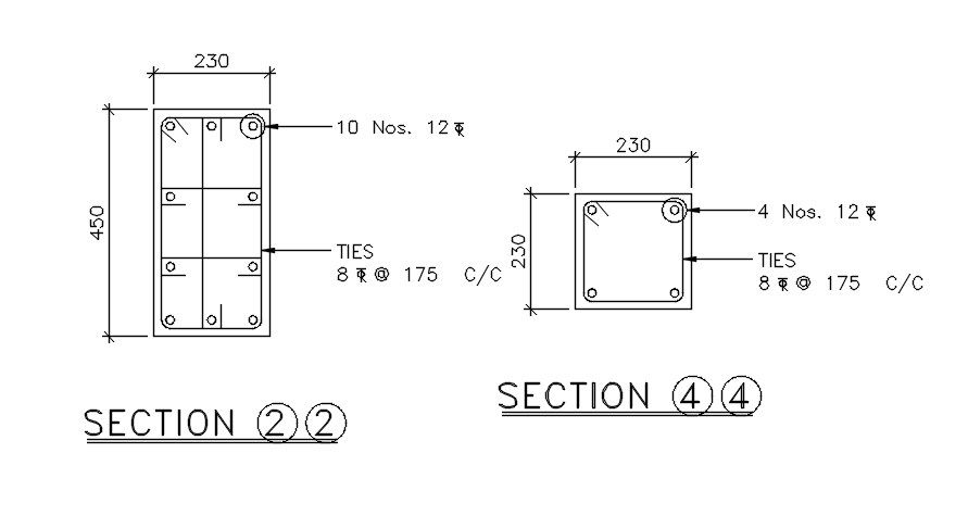 AutoCAD section details footing and column plan office with store building with store is described. Both rectangular and square column dimensions, the lateral ties specification and spacing between the footing are mentioned. For detailed analyse of dimension download the DWG file from our website.