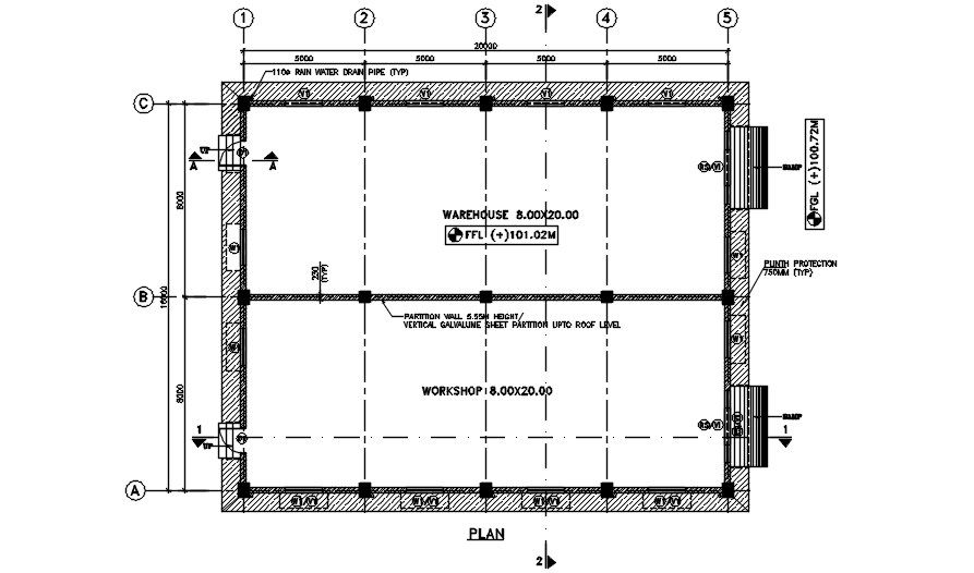 Warehouse beam-column plan specified in this AutoCAD drawing file. Download this 2d AutoCAD drawing file.