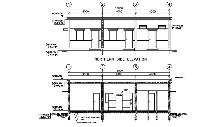 Bunglow side elevation drawing presented in this AutoCAD drawing file. door window and levels detail drawing with dimensions and naming detail are given in it. this can be used by architects and civil engineers. Download this 2d AutoCAD drawing file.