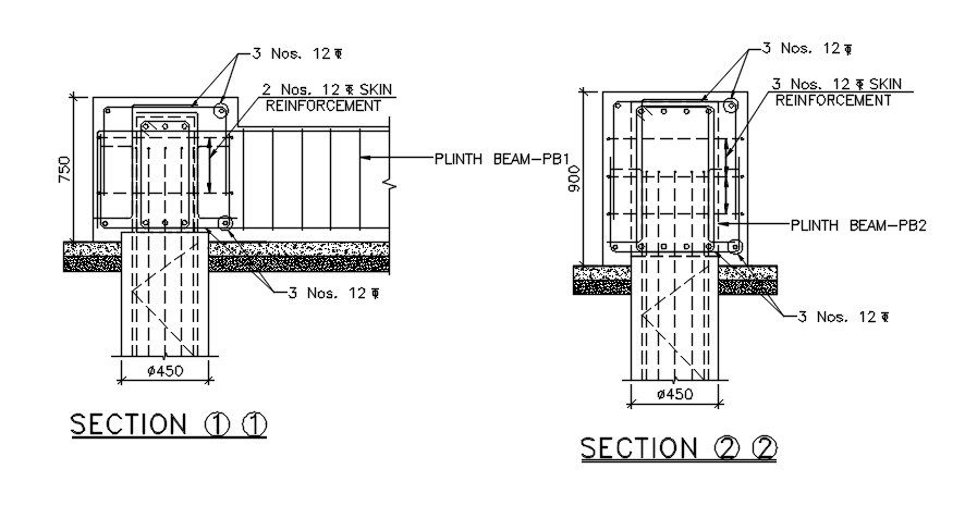 The reinforcement section detail is shown int his AutoCAD drawing file. 450 x 750 and 450 x 900 size of column detail presented in this file. dimensions and naming detail is given in it. this can be used by architects and civil engineers. Download this 2d AutoCAD drawing file.