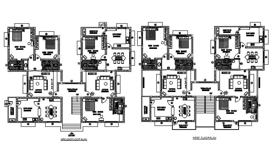 A Ground floor plan and first-floor plan of the apartment stated in this AutoCAD drawing file. this file consists of living, dining, bedroom detail with services, and staircase details are given in this file. this can be used by architects and engineers. Download this 2d AutoCAD drawing file.