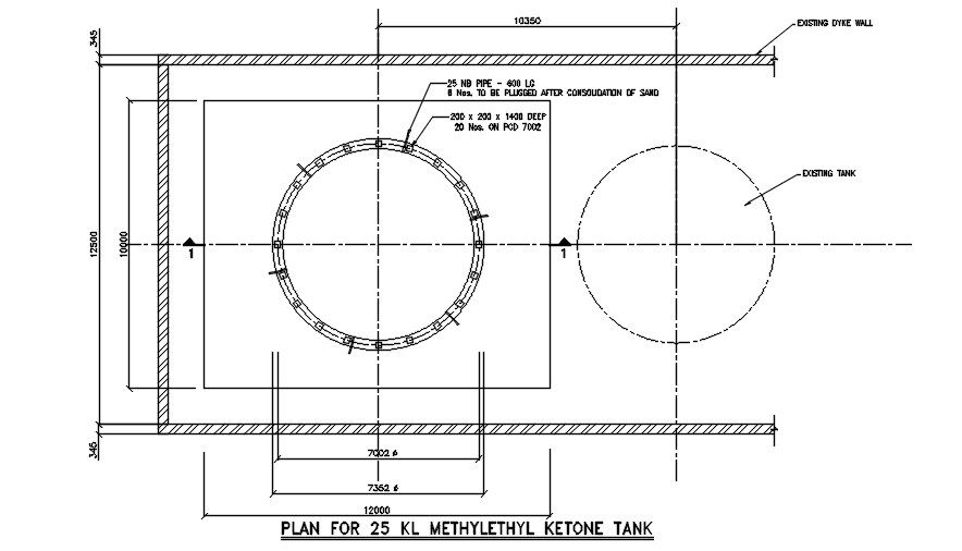 AutoCAD Foundation Plan of a 25KL Methylethyl Ketone Tank is described. The plan incorporated with the material specification, existing tank & dyke wall description, cross sectional details and reinforcement requirements. Download the 2D plan for enhanced terms.