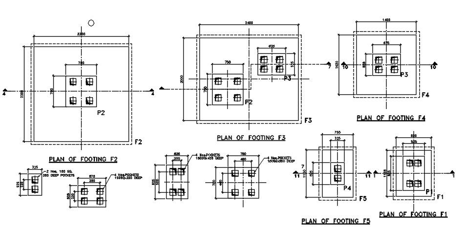 Plan of footing detail drawing presented in this AutoCAD drawing file. several foundation details are given in it. also, dimensions and material specification detail is given in it. this can be used by architects and engineers. Download this 2d AutoCAD drawing file.
