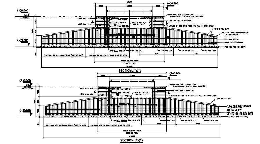 AutoCAD Reinforcement section plan of Transmission tower. The reinforcement details with cross sectional dimensions of the structural elements are specified. Square mesh reinforcement, Layers of the bars are also mentioned. Download the AutoCAD 2D file from our website.