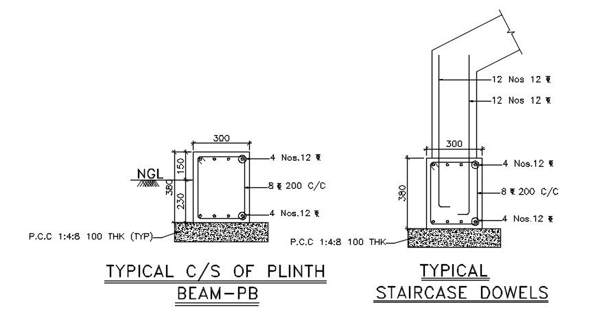 The plinth beam reinforcement detail drawing stated in this AutoCAD file. staircase detail of reinforcement also given. the section detail with steel bar detail given with dimensions and material specification detail is given in it. this can be used by architects and engineers. Download this 2d AutoCAD drawing file.