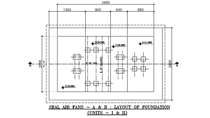 Seal air fans foundation detail drawing specified in this file. foundation plan centerline drawing with dimensions and material specification detail is given in this file. this can be used by architects and engineers. Download this 2d AutoCAD drawing file.