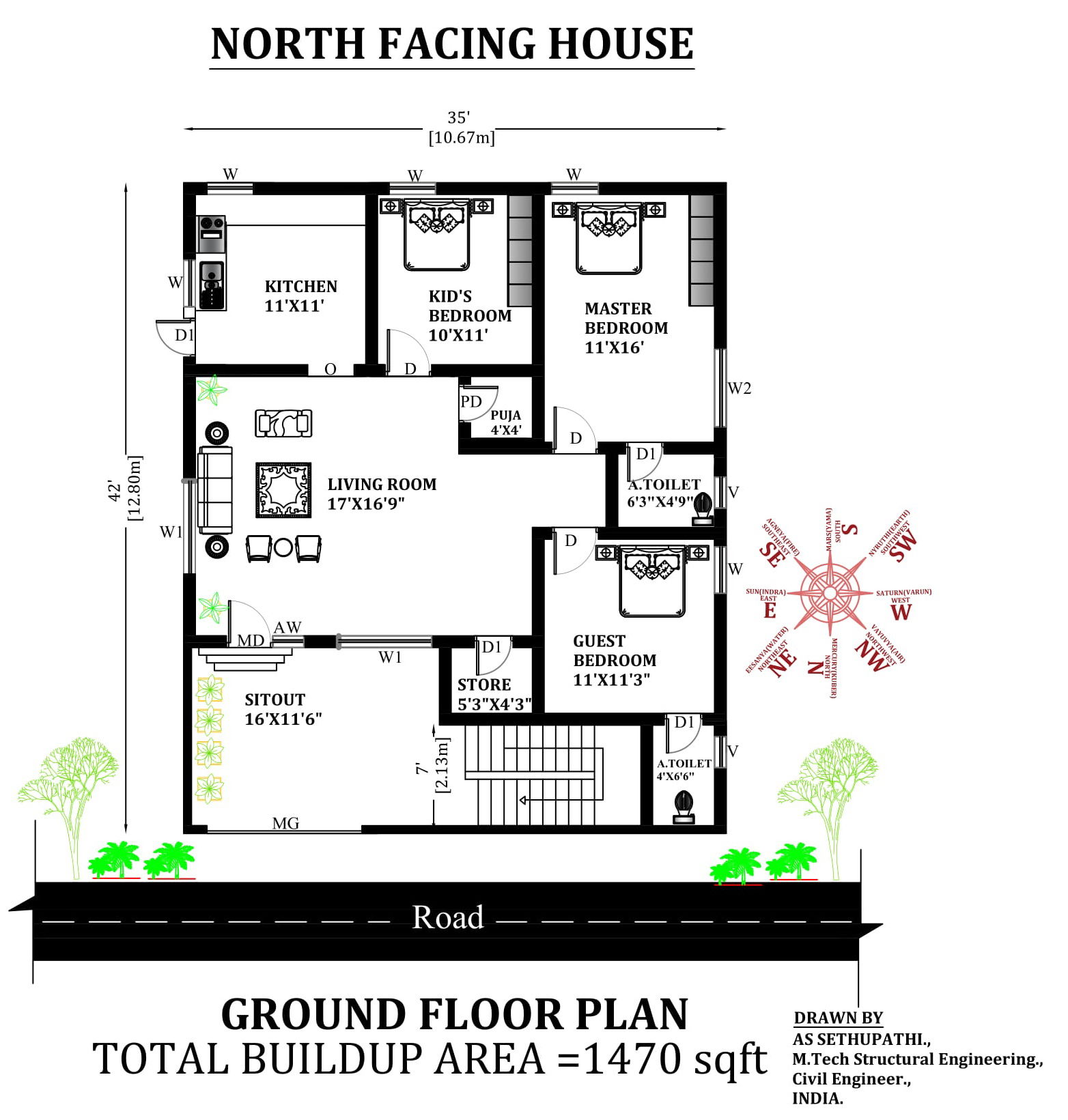35'X42' Marvelous North facing 3bhk Furniture house plan as per Vastu Shastra. The total Buildup area of this house plan is 1470 sqft. The master bedroom is in the southwest direction with the attached toilet in the west and the kid's bedroom is in the south. The guest bedroom is in the northwest. kitchen is placed in the southeast. The storeroom is in the north. Hall and sitout are available in the northeast direction. Puja room available in the west direction. The staircase placed in the northwest direction outside of the house. Download Autocad DWG and PDF file.