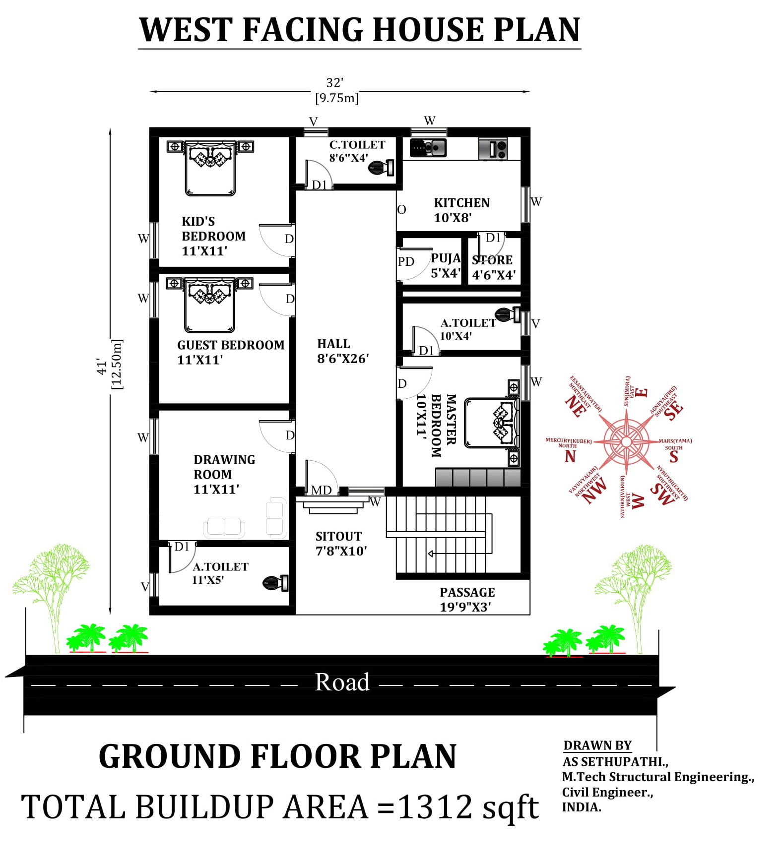 32'X41' Wonderful West facing 3bhk house plan as per Vastu Shastra. The total Buildup area of this house drawing is 1312 sqft. The master bedroom is in the southwest direction with the attached toilet in the south and the kid's bedroom is in the northeast. The guest bedroom is in the north. kitchen is placed in the southeast. The storeroom is in the south. The hall is available in the center of the house. Puja room available in the south direction. The staircase placed in the southwest direction outside of the house. Download Autocad DWG and PDF files.