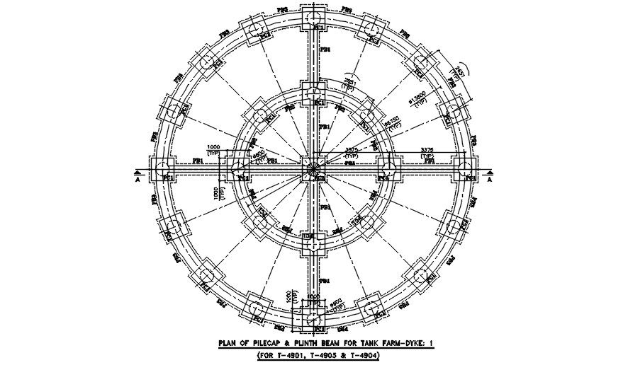 Plan of pile cap and plinth beam for water tank has given in this Autocad DWG drawing file. In this mode pile caps are mentioned with the size. Circular pile caps are provided in this drawing model. There are two different circular pile cap were provided. Thank you for downloading the Autocad file and other CAD program files from our website.