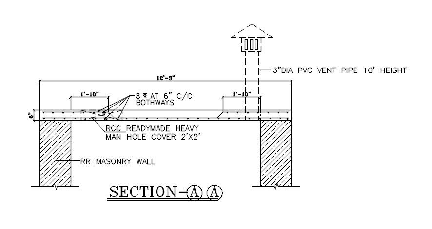 Section details of foundations has given in the Autocad DWG drawing file. Bars are provided with 8mm dia at the space of 6”c/c to both ways. The size of RCC readymade heavy man hole cover is 2’x2’. RR masonry wall has provided. 3” dia PVC vent pipe with 10’ height were provided. Thank you for downloading the Autocad file and other CAD program files from our website.