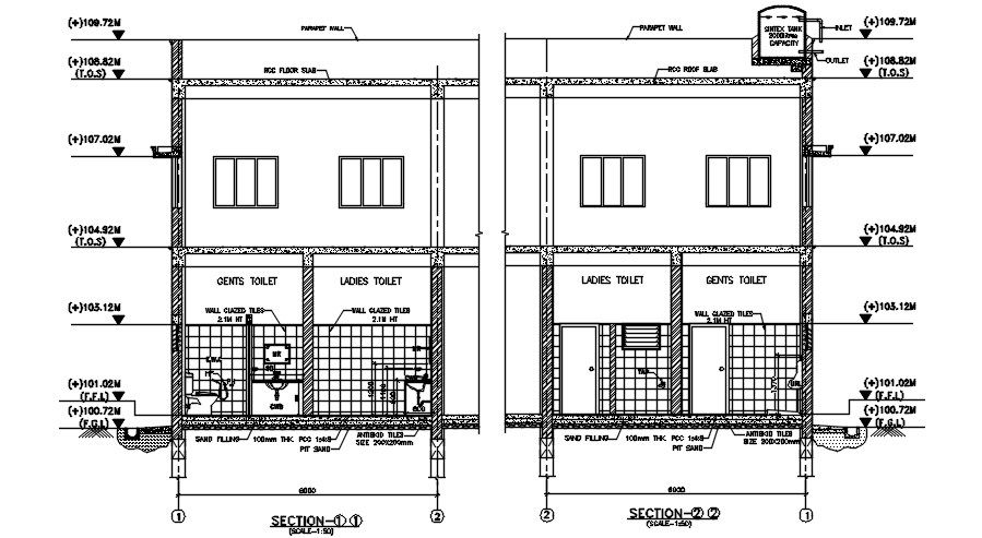 A laboratory toilet section detail is given in this Autocad 2D DWG drawing file. Sand filling is done for 100mm thickness. Size of antiskid tiles is 200x200mm. It’s provided for gents and ladies. Parapet wall and RCC roof slab is mentioned in this section drawing. Sintext tank is provided with the capacity of 2000 liters. Thank you for downloading the Autocad file and other CAD program files from our website.