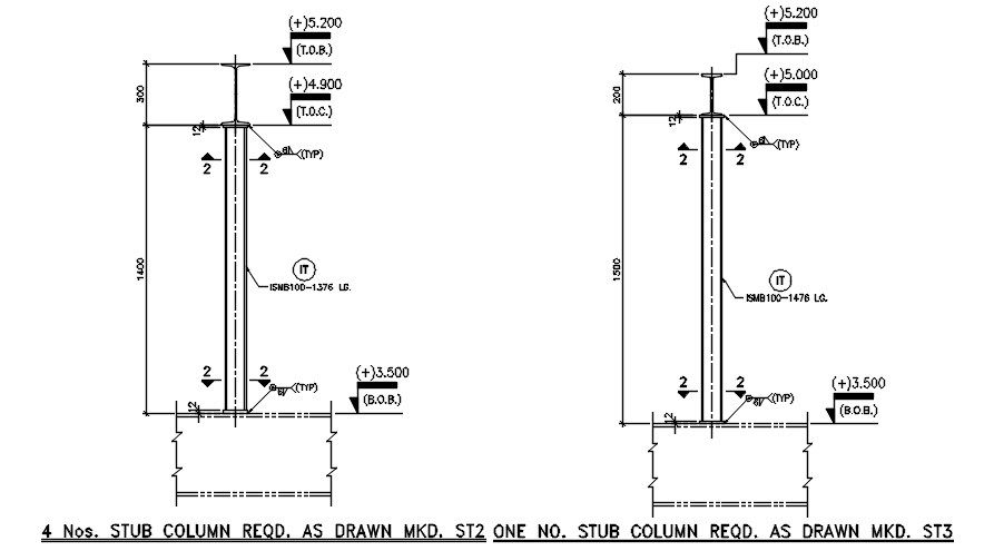 A section detail of stub column has given in this AutoCAD 2D DWG drawing file. 4 nos of stub column is provided for ST2. At ST3, one number of stub column is provided. Other details are given clearly in this drawing file. Download the Autocad DWG drawing file. Thank you for downloading the AutoCAD file and other CAD program files from our website.