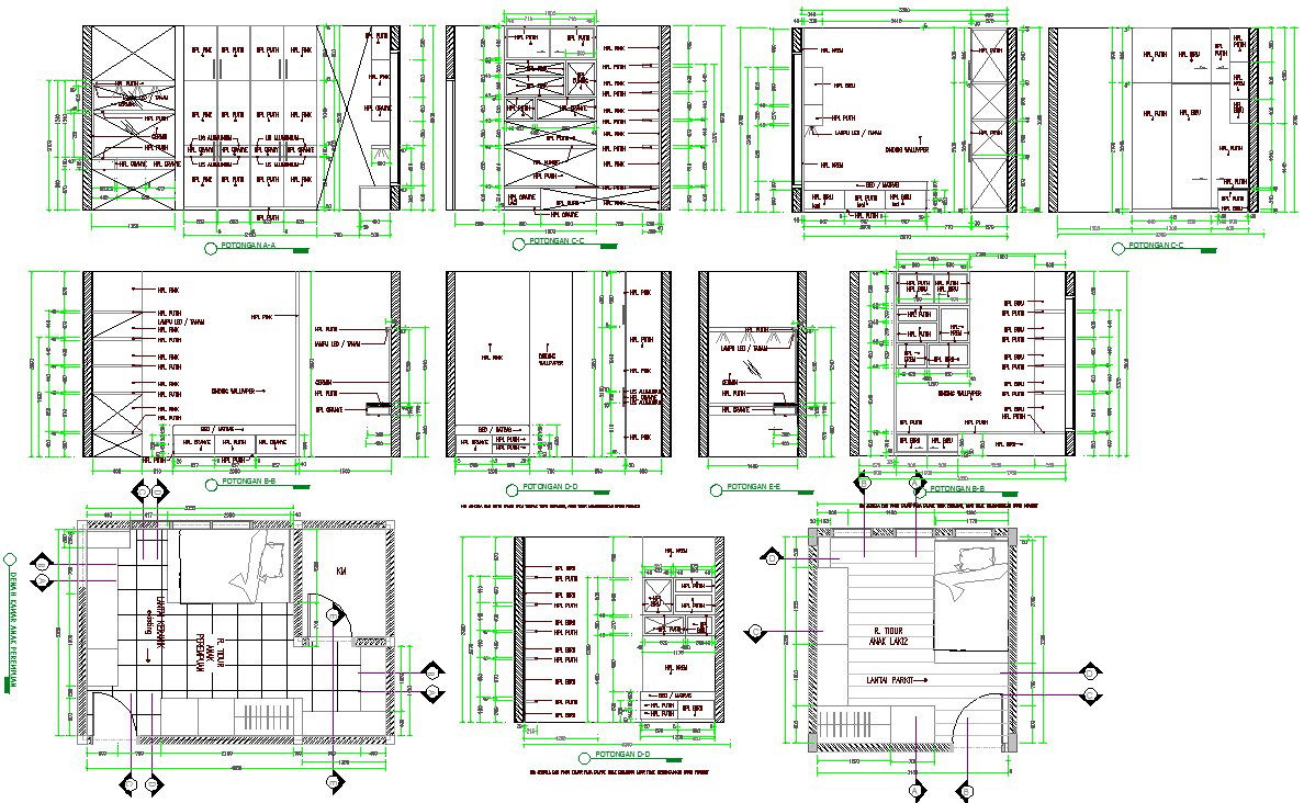 Bedroom interiors detail in Autocad. Include Bed detail and sections, wardrobe design and sections, Study table drawing, and seem detail about bedroom interiors designs.