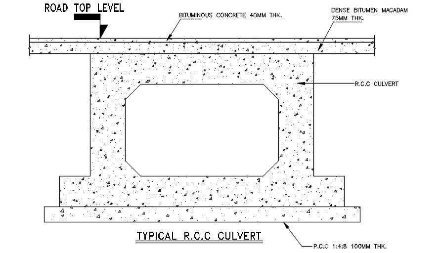 AutoCAD typical plan of RCC culvert design. PCC of 100 mm thick layered ate bottom to reduce permeability of structure. the culvert designed as such requirement of standards to cross sectional dimensions are provided. Download the file file for enhanced nomenclatures.