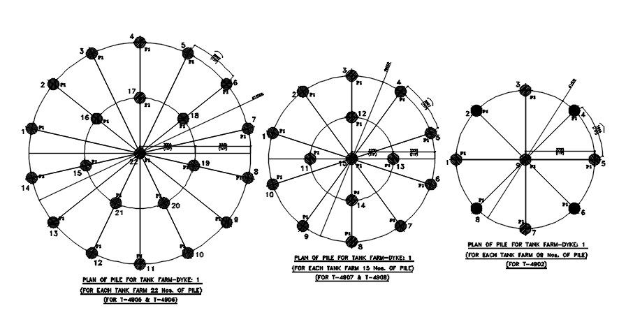 Plan of pile for tank farm is given in this Autocad DWG drawing file. In this, there are three tanks provided with different sizes. For first, second and third tanks are provided with 22, 15 and 9 nos respectively. Thank you for downloading the Autocad drawing file and other CAD program files from our website.