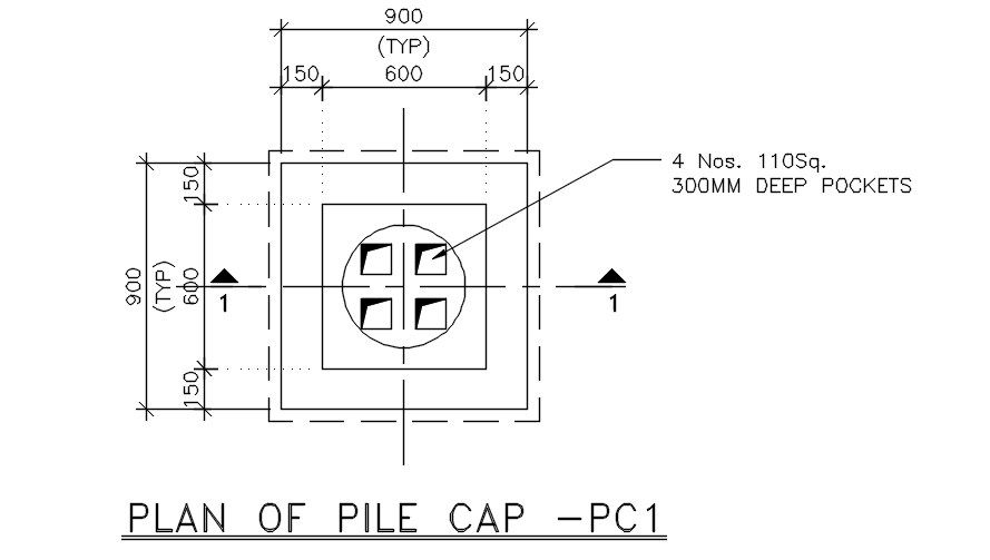 Plan of pile cap of Weigh Bridge is given in this Autocad 2D DWG drawing file. Length and breadth of pile cap is 600x600mm. 4nos of 300mm deep pockets is provided for 110sq. Thank you for downloading the Autocad drawing file and other CAD program files from our website.