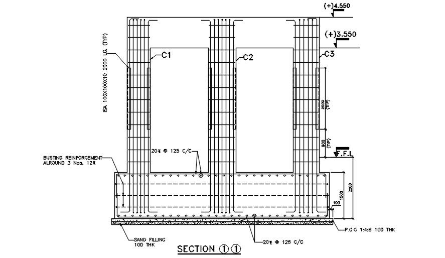 Foundation reinforcement of culvert design is described. The bottom most layered with Sand filing and PCC to avoid permeability with ground level. Main Reinforcement and lateral reinforcement dimensions and cross sections of culvert is enumerated. Download the file from out website for enhanced view