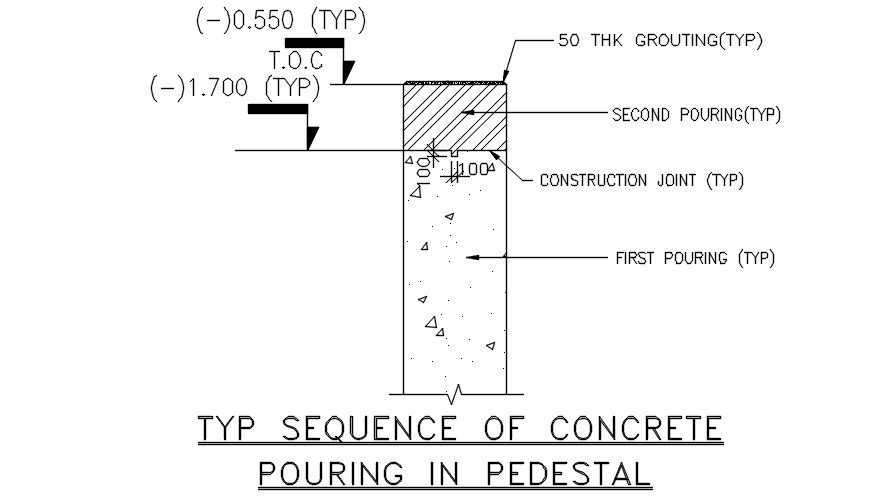 Typical sequences of concrete pouring in pedestal details are given in this AutoCAD DWG drawing file. 50mm thicknesses of grouting were done. Then second pouring below it construction joints are done. At last first pouring is done. Thank you for downloading the AutoCAD drawing file and other CAD program files from our website.