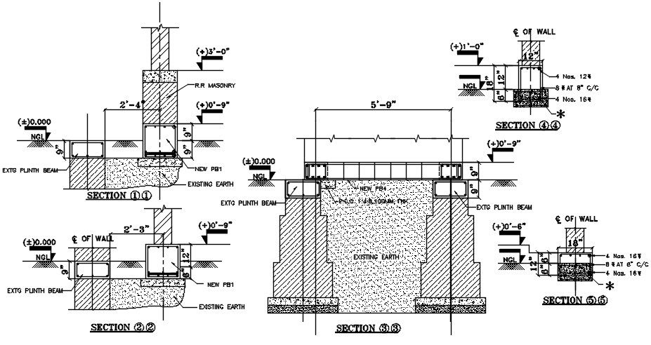 Section view of the plinth beam is given in this 2D Autocad DWG drawing file. There are five sections given. Existing earth work and plinth beams are mentioned in this drawing model. Thickness of PCC is 100mm. 4 nos of 12mm bar is used with at the top section 4. 4 nos of 16mm bar is used with at the top section -5. 4 nos of 16mm bar is used with at the bottom section 4&5. Thank you for downloading the AutoCAD drawing file and other CAD program files from our website.