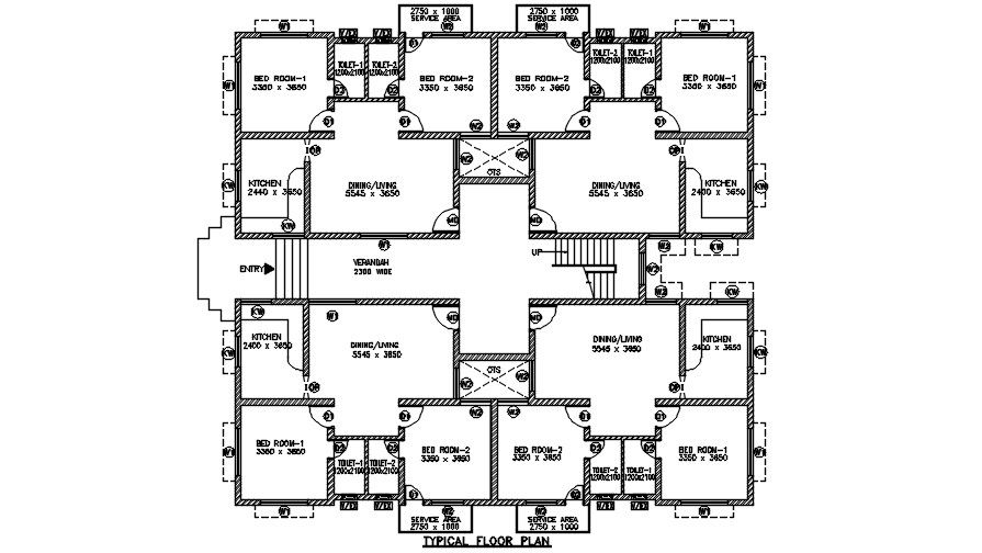 25x9m Typical floor plan of family quarters are given in this AutoCAD DWG drawing file. Kitchen, two bed rooms, two toilets, wash room, dinning/living hall, balcony and service area is available in this plan. Above one is same for all. Thank you for downloading the AutoCAD 2D DWG drawing file and other CAD program files from our website.