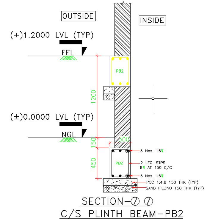 Plinth beam detail specified in this AutoCAD drawing file. section detail of plinth beam with sand filling and PCC the layer with dimensions and material specification detail is given in it. this can be used by architects and engineers. Download this 2d Autocad drawing file.