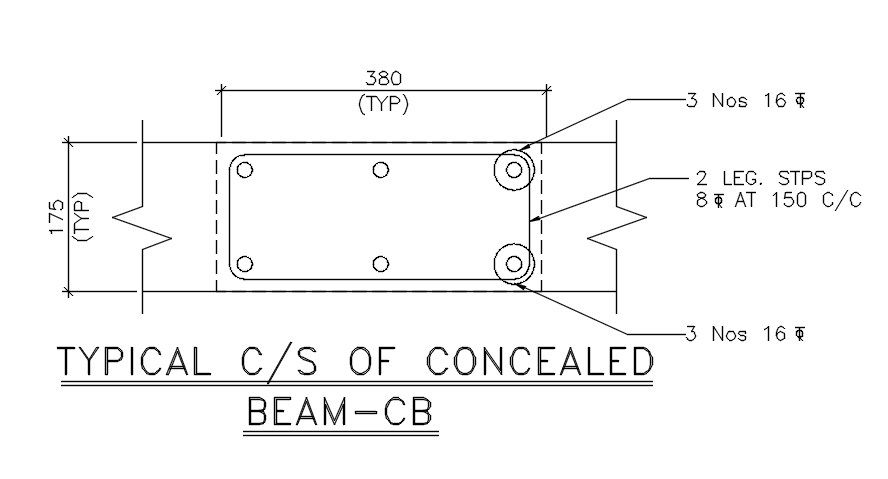 AutoCAD diagram describing typical Cross sectional of Concealed beams Concealed beams are popular and form an essential part of modern reinforced concrete framed structures. Skin reinforcement and transverse reinforcement with C/C spacing of the beam are specified. For detailed analyse of dimension download the DWG file from our website.
