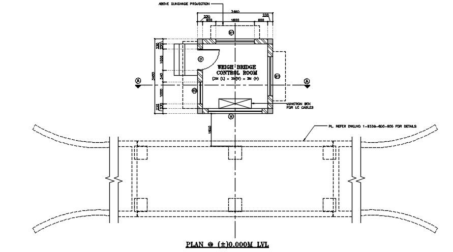 AtuoCAD Layout of Weigh bridge control room. Junction box with LC cables, sunshade projection for the room is specifies. Efficient energy design with overall dimension of 3.5m x3.5m is provided. For detailed analyse of dimension download the DWG file from our website.