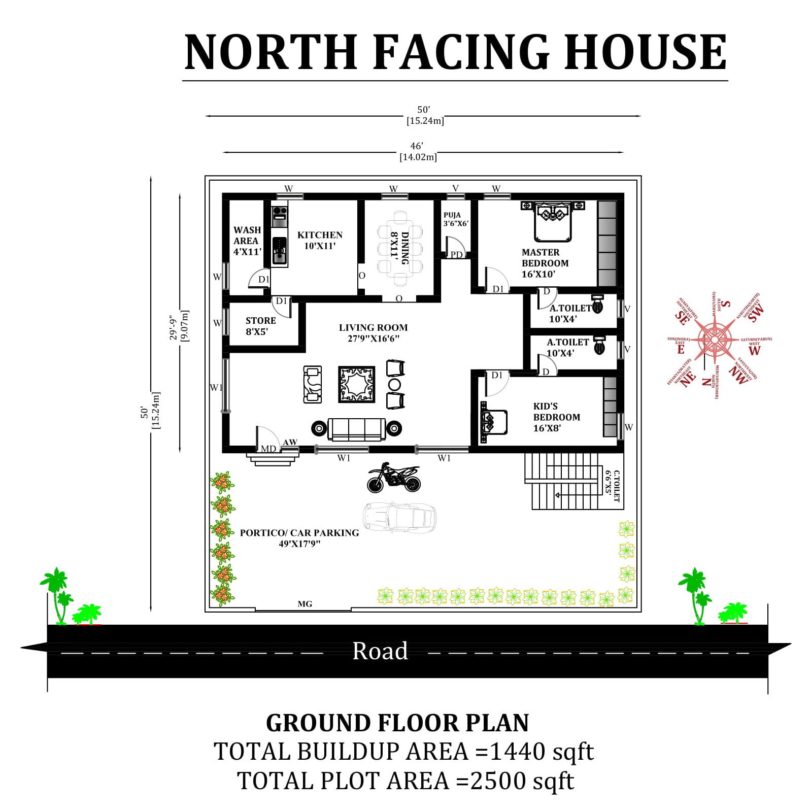 50'X50' North facing 2bhk Vastu house plan. The total Buildup area of this house plan is1440 sqft. The total plot area is 2500 sqft. The master bedroom is in the southwest direction with the attached toilet in the west. The kid's bedroom is in the northwest with the attached toilet in the west. kitchen is placed in the south. The Wash area is in the southeast. The storeroom is in the east. The living room and the portico are available in the northeast direction. The puja room is available in the north direction. The staircase is placed in the northwest direction outside of the house. Download Autocad DWG and PDF file.