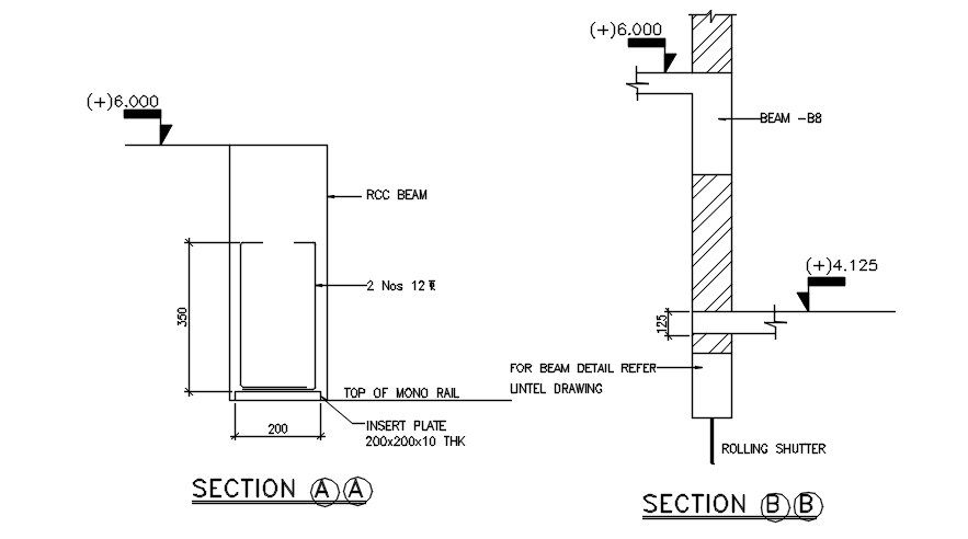 RCC Beam's typical section detail is given in this AutoCAD drawing file. this file consists of reinforcement detail given with dimensions, RCC Beam, top of the monorail, insert plate, lintel drawing, Beam, rolling shutter, and material specification. This drawing file is useful for architects and civil engineers. Download this 2d Autocad drawing file.