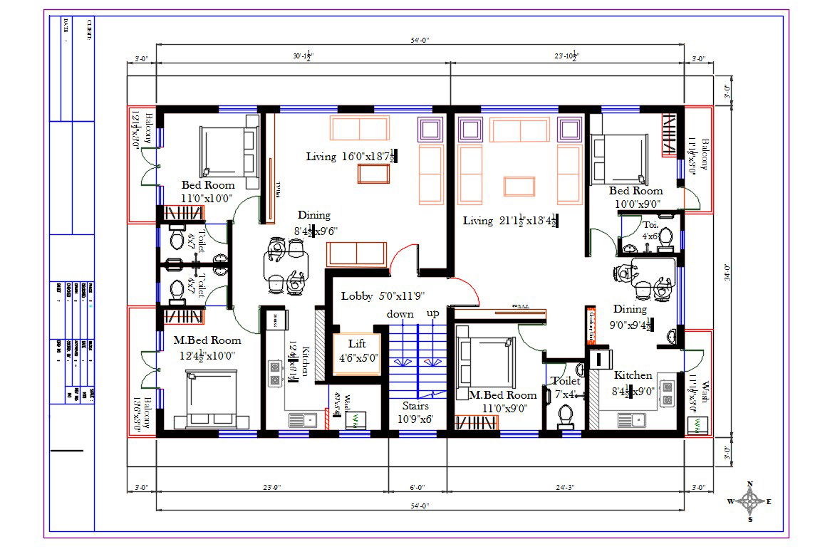 54'X34' Apartment 2 BHK Layout Plan CAD Drawing