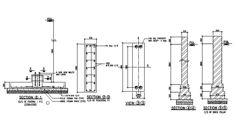 A section detail of foundation is given in the form of 2D AutoCAD DWG drawing file. Thickness of sand filling and PCC is 100mm. Cross section of footing, pedestal and brick pillar is mentioned in this drawing file. Thank you for downloading the AutoCAD 2D DWG drawing file and other CAD program files from our website.