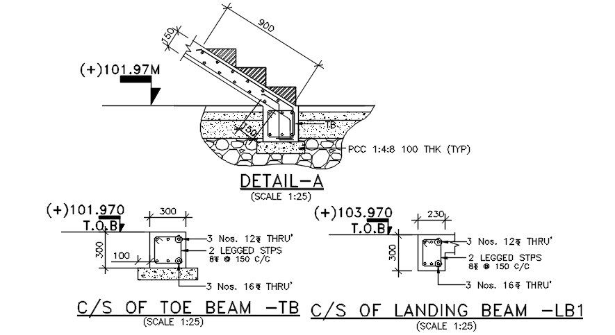 Typical layout and details of staircase of control room is given in this 2D Autocad DWG drawing file. Cross section of toe beam and landing beams are given in this drawing file. Thickness of PCC is 100mm. Thank you for downloading the AutoCAD 2D DWG drawing file and other CAD program files from our website.